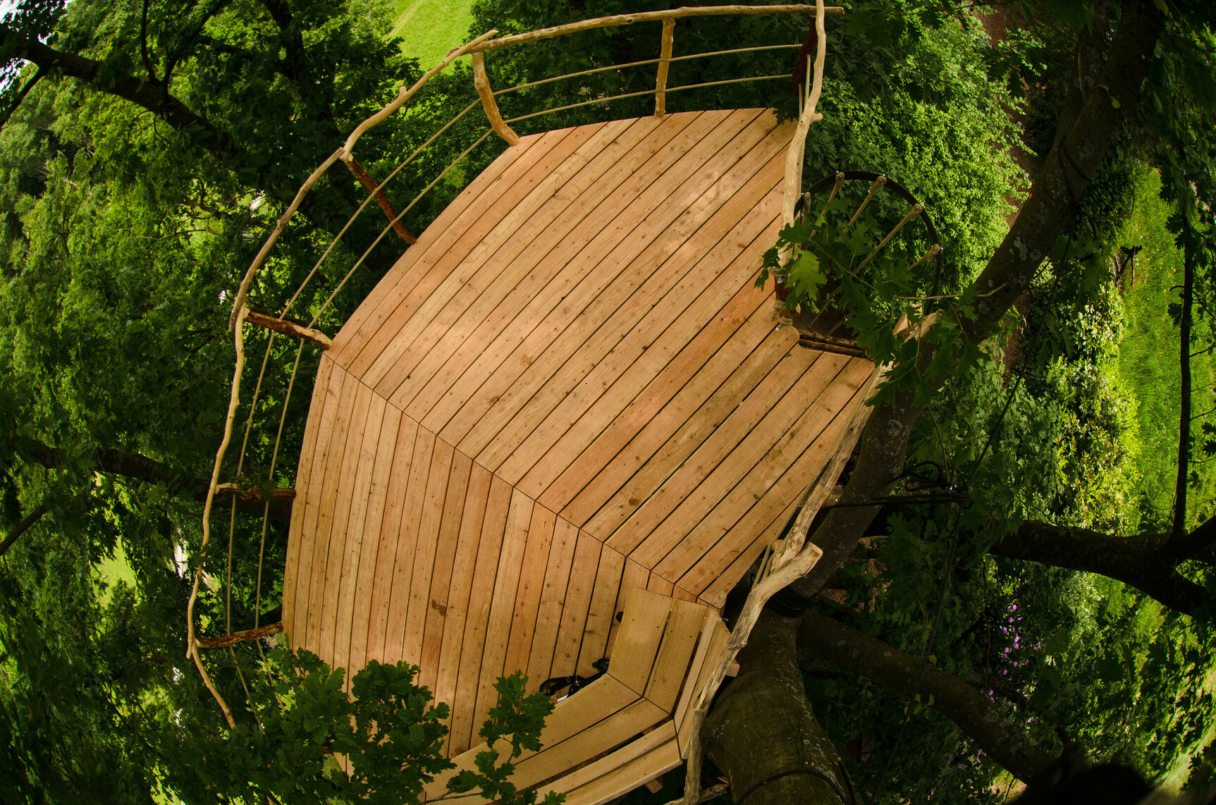 Da wir aber in der Regel lebende Organismen als statische Basis verwenden, wäre es grob fahrlässig, die Bäume und das Bauwerk nicht mindestens einmal im Jahr und nach jedem großen Sturm von einer entsprechend qualifizierten Person auf Sicherheit und Stabilität hin kontrollieren zu lassen. Darüber hinaus sollten die Terrassen und alle Ritzen im Holz jeden Herbst gereinigt werden, um dauerhafte Feuchtigkeit zu vermeiden. Im Schatten unter Bäumen entstehen mit den Jahren am Holz auch organische Beläge, die in der Feuchtigkeit auf Stufen, Terrassen oder Handläufen rutschig werden können. Hier kann man ganz einfach mit einem Hochdruckreiniger wieder Abhilfe schaffen.