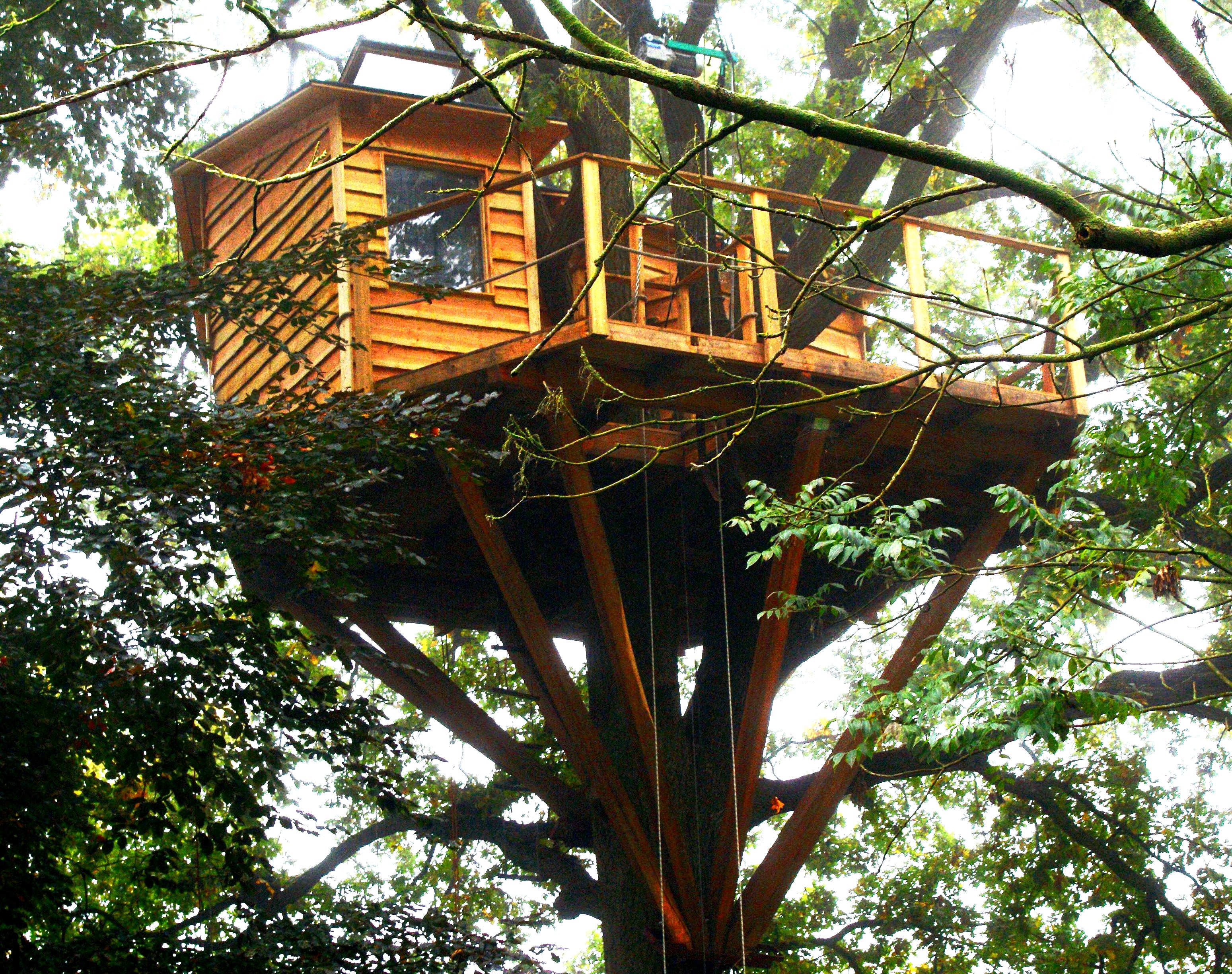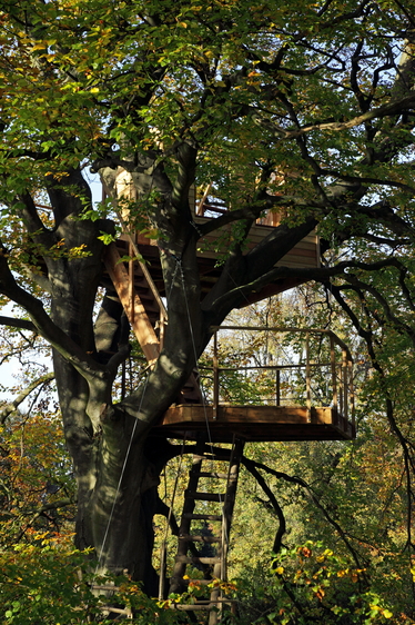 Aber wenn es die Bäume ermöglichen und jemand ein richtiges Haus mit Dachfenstern, Isolierung, Bett und Holzofen in 12 Meter Höhe wünscht, so freut uns das natürlich auch besonders und wir helfen gerne dabei mit einen großen Buchenstamm mitten durch das Haus wachsen zu lassen.