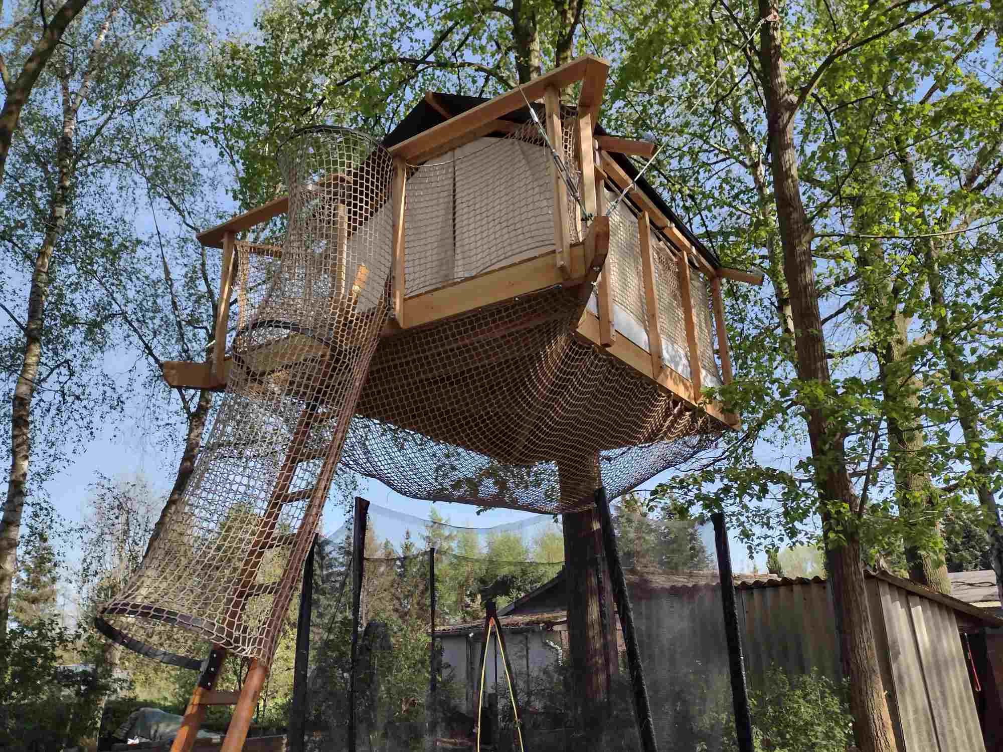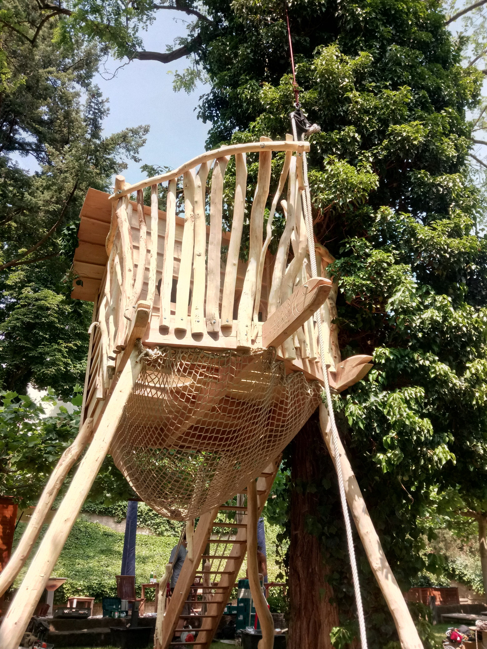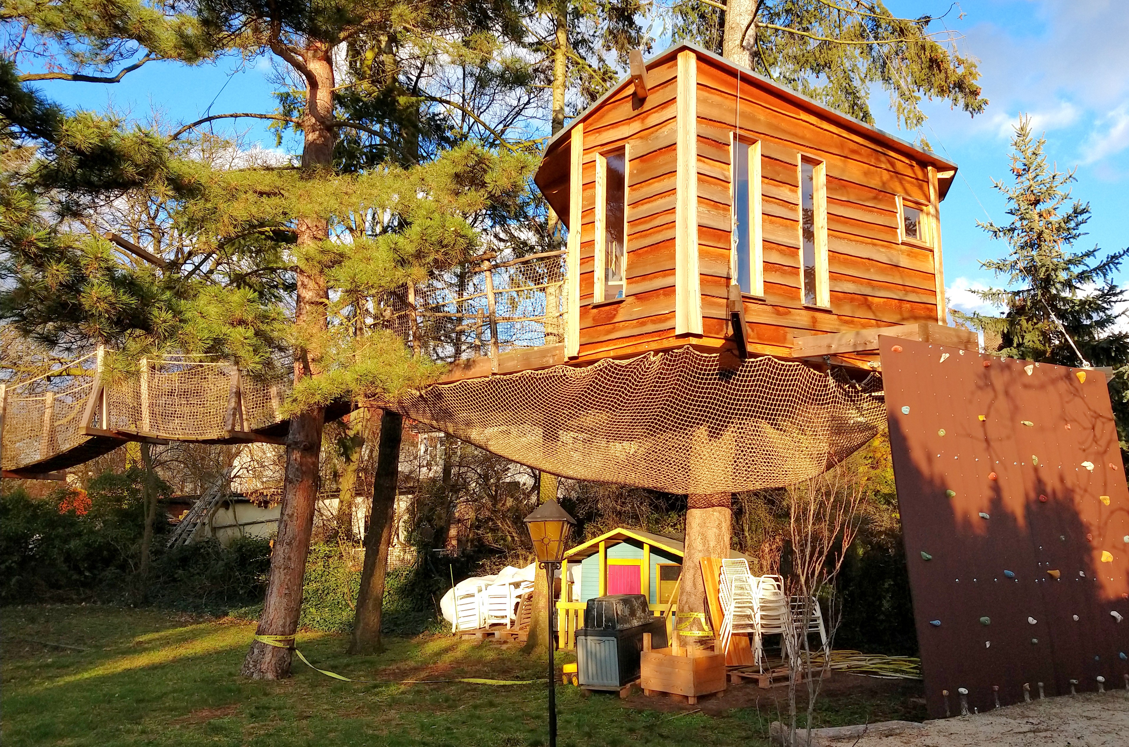 Es ist uns das Schönste immer neue Spielelemente und interessante Features für Groß und Klein zu entwickeln! Zum Beispiel bekommen viele Baumplattformen bei uns eine zweite Ebene mittels eines Netzes unterhalb der eigentlichen Plattform, in die man durch ein Loch im Fußboden nach unten einsteigen kann. Dieses Netz erschafft als große und ringsum geschlossene Hängematte einen ganz besonderen Raum, den vor allem Kinder als exklusiven Rückzugsort weit über den Köpfen der Eltern zu schätzen wissen.