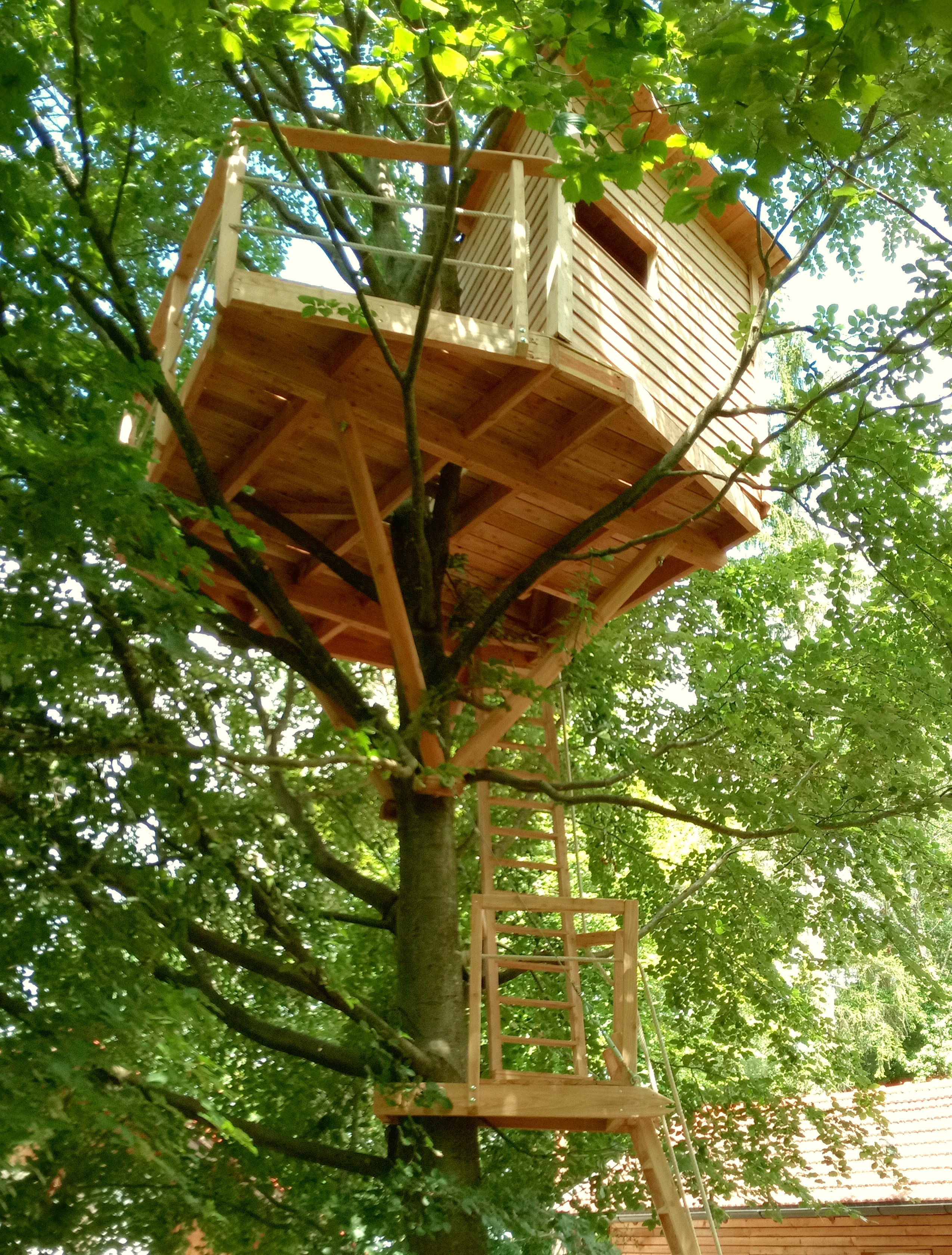 Oft ist das schwierigste beim Baumhausbau die Konstruktion einer Zustiegsmöglichkeit, die einerseits den Fähigkeiten und der Abenteuerlust der zukünftigen NutzerInnen angepasst sein muss, andererseits aber auch optisch möglichst zurückhalten bleiben soll. Denn wenn man in eine Höhe von nur 6 Metern eine normale Treppe bauen wollte, hieße das quasi einen kompletten Turm neben das Baumhaus stellen zu müssen. Daher haben wir eine ganze Reihe von kreativen Möglichkeiten entwickelt, um auch auf größere Höhen entspannt und sicher gelangen zu können. Zum Beispiel durch Baumleitern mit Rückfallschutz, Netztunneln oder Hängebrückensystemen aus anderen Bäumen oder auch mal von dem Balkon des Wohnhauses im ersten Stock.