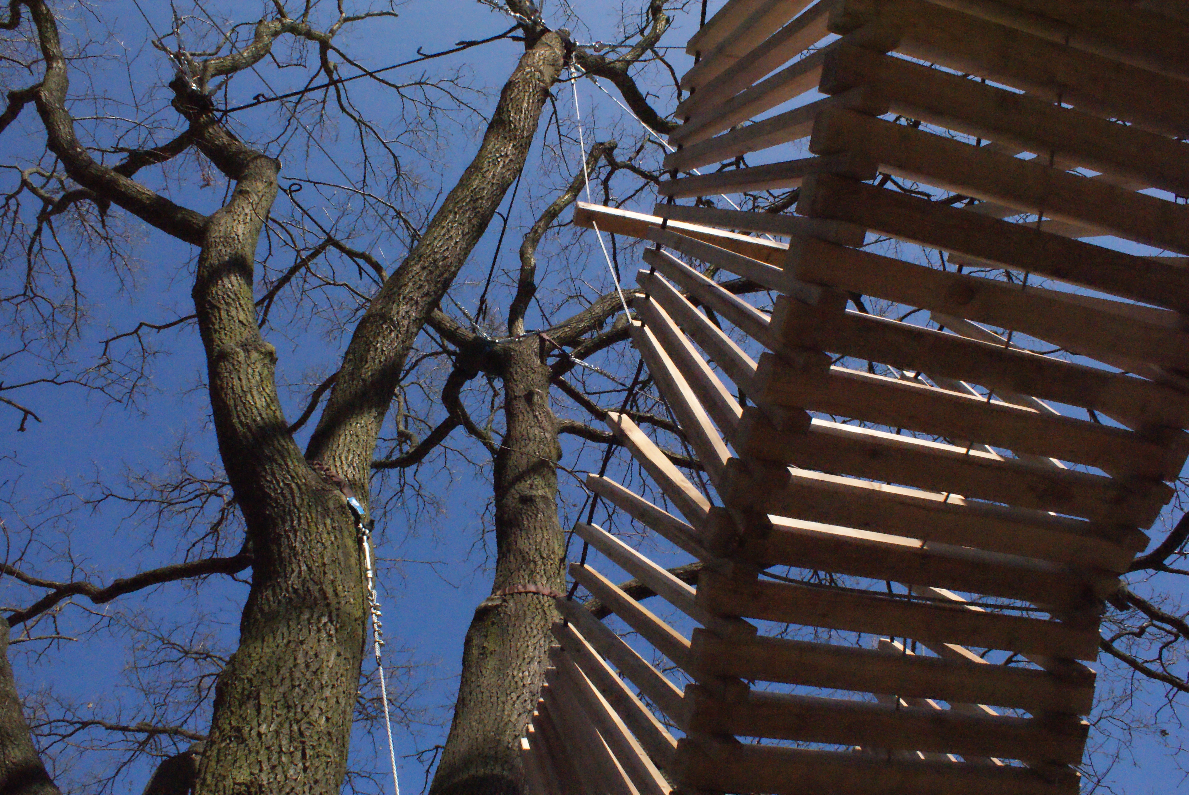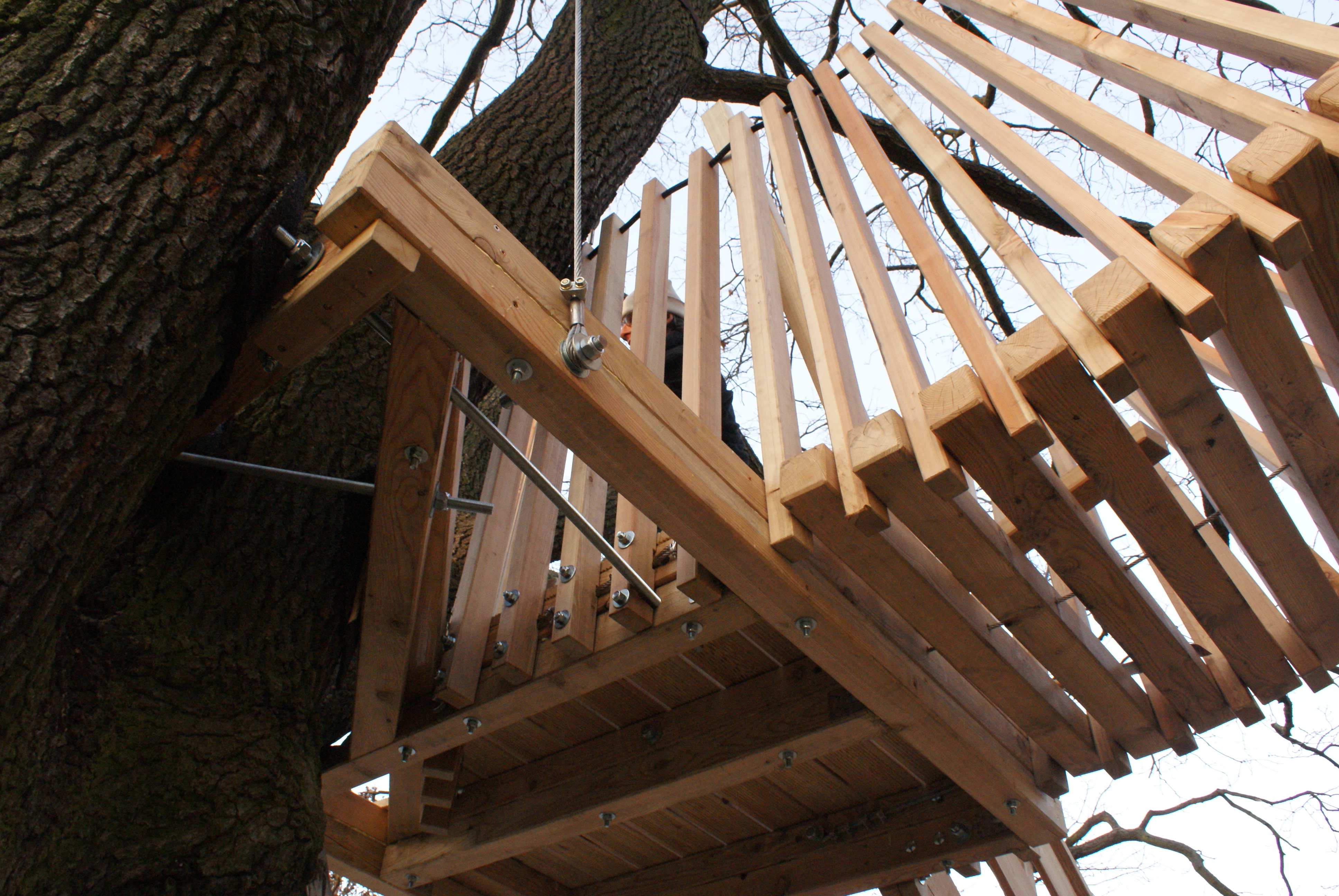 Trotz der futuristischen Züge war uns wichtig dem Bezug zum organischen Umwelt nicht zu verlieren. Ein Mittel Wind und Bewegung anderen Menschen zu spüren, liegt in der Art der Aufhängung. Mit Hilfe von breiten Schlaufen hängt der Hochsitz zwischen den Stieleichen und gewährt die Verbindung aus industriellen Charm und wechselhafter Natur.