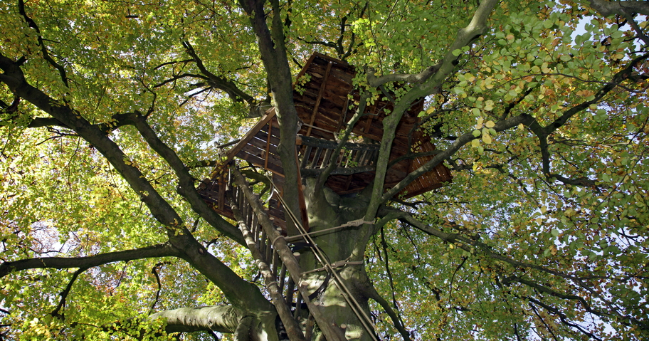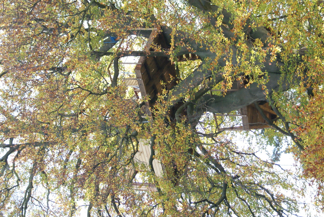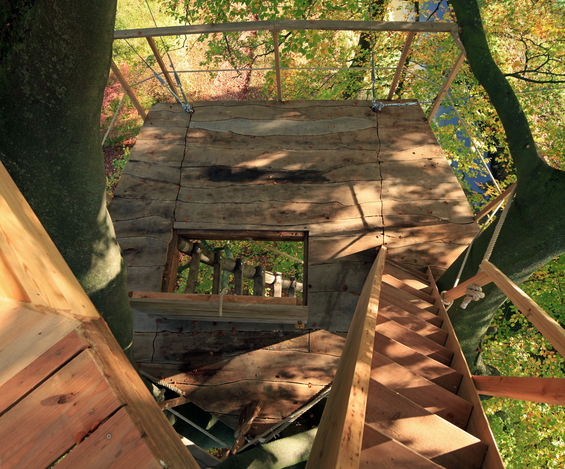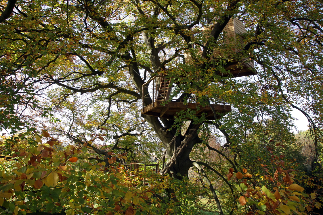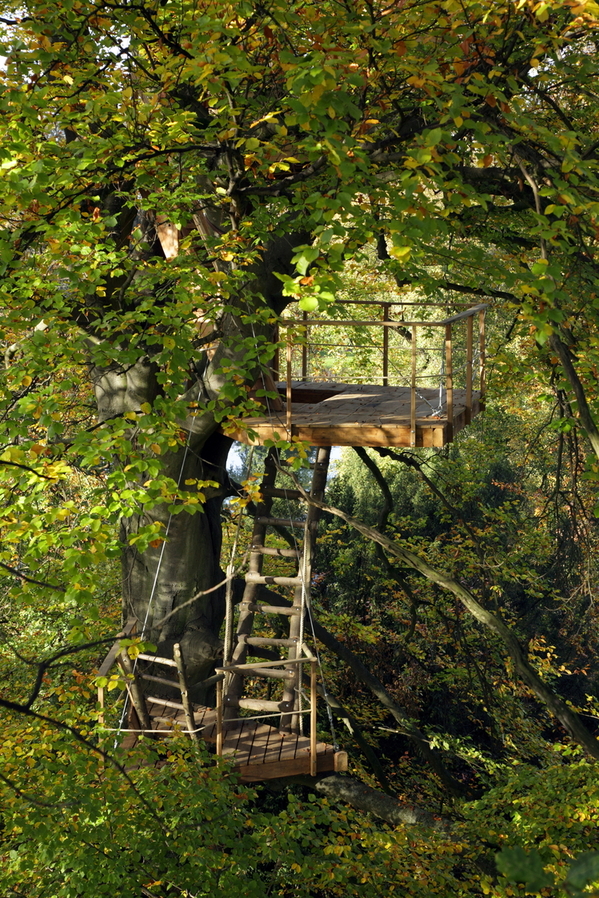Nie zuvor gelang es uns eine so perfekte Symbiose der Wünsche des Bauherren und der Besonderheiten des Baumes wie in diesem Schlosspark in Niedersachsen . In einer gedrehten Wendelbewegung verteilen sich 3 Leitern oder Treppen, 3 Plattformen und kleine Hütte bis hoch in die Krone des Baumes - ohne dabei die Schönheit der uralten Buche zu beeinträchtigen.