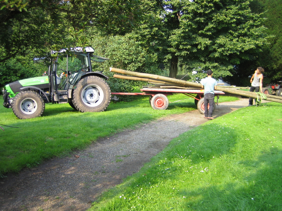 Selten stand uns ein solche Materialauswahl zur Verfügung: mit dem hofeigenen Traktor konnten wir uns selber im dazu gehörigen Wald Der Großteil der Materialien stammt nicht aus Baumarkt oder Sägewerk sonder aus dem umliegenden Wälder, Ländereien und wiederverwendeten Balken und Bohlen aus alter Bausubstanz. Der Effekt wird im fertigen Objekt sichtbar.