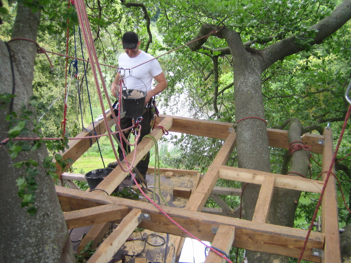 Anders als sonst konnten wir hier fast nichts am Boden vormontieren, sondern mussten alles quasi in der Luft sägen und schrauben. Unsere hängenden Arbeitsplattformen waren da eine große Hilfe!